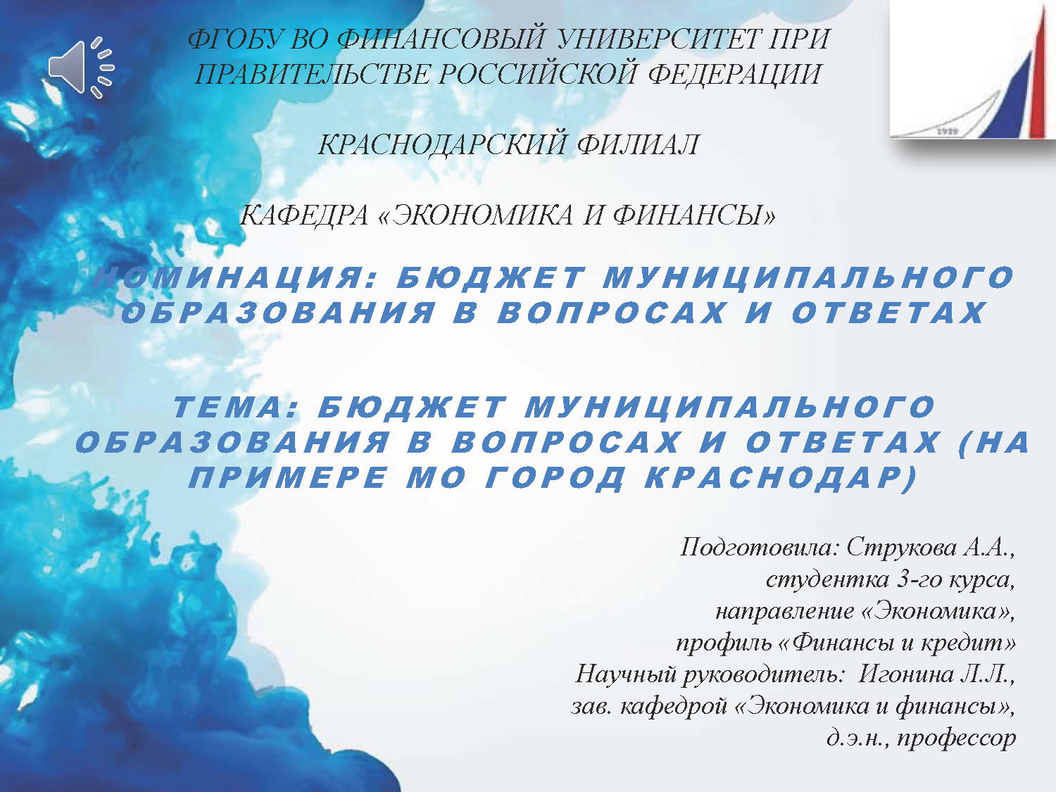 Струкова, А.А. Бюджет муниципального образованияв вопросах и ответах на примере МО город Краснодар [Электронный ресурс]. — Электронные данные (1 файл: 15 Мб), 2017. — (Коллекция: Конкурс проектов по представлению бюджета для граждан). — Только электронный ресурс;. — Свободный доступ из сети Интернет (чтение, печать, копирование). — <URL:http://elib.fa.ru/STW/2017/konkurs2017_strukova.pptx>.Record create date: 11/8/2018 Subject: РФ; Россия; полный текст; электронные публикации; бюджет; бюджетные расходы; бюджетные средства; бюджетирование; проекты; конкурсы; Представление бюджета для граждан; 2017 г.; местный бюджет; региональный бюджет; бюджетная система; интерактивные методы; муниципальная система; гражданские инициативы; видео Allowed Actions: Download (14.9 Mb) Group: Anonymous Network: Internet |