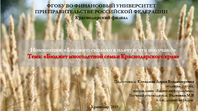 Копылова, Д. В. Бюджет многодетной семьи Краснодарского края. [Электронный ресурс.] / Д.В. Копылова, М.В. Радченкова; Финуниверситет. — Электронные данные (1 файл: 30,1 Мб). — Только электронный ресурс;. — Свободный доступ из сети Интернет (чтение, печать, копирование). — <URL:http://elib.fa.ru/STW/2019/konkurs_2019_226.pptx>.Record create date: 10/1/2019 Subject: РФ; Россия; полный текст; электронные публикации; бюджет; бюджетные расходы; бюджетные средства; бюджетирование; проекты; конкурсы; Представление бюджета для граждан; 2019 г.; местный бюджет; региональный бюджет; бюджетная система; интерактивные методы; муниципальная система; гражданские инициативы; видео Allowed Actions: Download (39 Mb) Group: Anonymous Network: Internet |