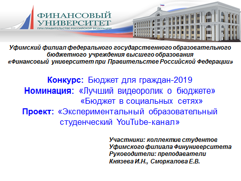 Князева, И.Н. Экспериментальный образовательный студенческий YouTube-канал. [Электронный ресурс.] / И.Н. Князева, Е.В. Сморкалова; Финуниверситет. — Электронные данные (1 файл:15 Мб). — Только электронный ресурс;. — Свободный доступ из сети Интернет (чтение, печать, копирование). — <URL:http://elib.fa.ru/STW/2019/konkurs_2019_234.ppt>.Record create date: 10/4/2019 Subject: РФ; Россия; полный текст; электронные публикации; бюджет; бюджетные расходы; бюджетные средства; бюджетирование; проекты; конкурсы; Представление бюджета для граждан; 2019 г.; местный бюджет; региональный бюджет; бюджетная система; интерактивные методы; муниципальная система; гражданские инициативы; видео Allowed Actions: Download (2.8 Mb) Group: Anonymous Network: Internet |