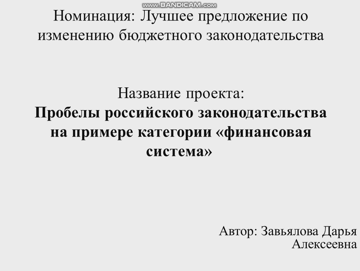 Завьялова, Дарья Алексеевна. Проблемы Российского законодательства на примере категории «финансовая система»[Электронный ресурс.]: 2е место / Финансовый университет. — Электронные данные (1 файл 17 Мб). — Только электронный ресурс;. — Свободный доступ из сети Интернет (чтение, печать, копирование). — <URL:http://elib.fa.ru/STW/2021/konkurs_2021_F14.avi>.Дата создания записи: 01.10.2021 Тематика: РФ; Россия; полный текст; электронные публикации; бюджет; бюджетные расходы; бюджетные средства; бюджетирование; проекты; конкурсы; Представление бюджета для граждан; 2021 г.; местный бюджет; региональный бюджет; бюджетная система; интерактивные методы; муниципальная система; гражданские инициативы Разрешенные действия: Загрузить (17,9 Мб) Группа: Анонимные пользователи Сеть: Интернет |