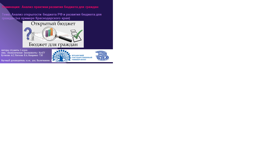 Мягкова, Валерия Андреевна. Анализ открытости бюджета РФ и развития бюджета для граждан (на примере Краснодарского края). [ Электронный ресурс.]: 2е место / Валерия Андреевна Мягкова, Анастасия Сергеевна Бугакова, Тихон Юрьевич Назаренко; Финансовый университет. — Электронные данные (1 файл 5Мб). — Только электронный ресурс;. — Свободный доступ из сети Интернет (чтение, печать, копирование). — <URL:http://elib.fa.ru/STW/2021/konkurs_2021_F16.pptx>.Record create date: 10/1/2021 Subject: РФ; Россия; полный текст; электронные публикации; бюджет; бюджетные расходы; бюджетные средства; бюджетирование; проекты; конкурсы; Представление бюджета для граждан; 2021 г.; местный бюджет; региональный бюджет; бюджетная система; интерактивные методы; муниципальная система; гражданские инициативы Allowed Actions: Download (5.2 Mb) Group: Anonymous Network: Internet |