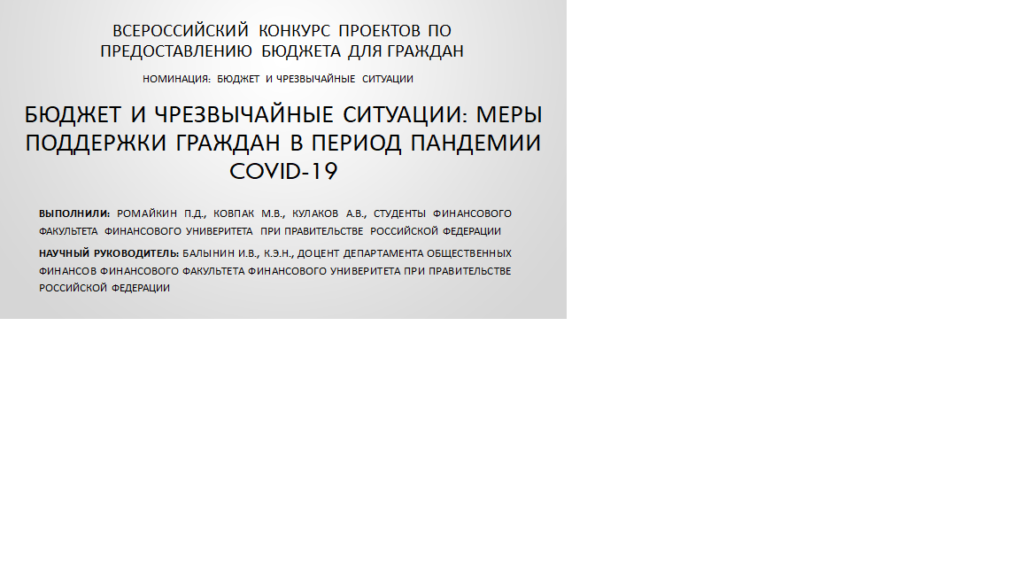 Бюджет и чрезвычайные ситуации: меры поддержки граждан в период пандемии COVID-19. [ Электронный ресурс.]: 3-е место / Павел Денисович Ромайкин, Александр Вадимович Кулаков, Максим Васильевич Ковпак; Финансовый университет. — Электронные данные (1 файл 3Мб). — Только электронный ресурс;. — Свободный доступ из сети Интернет (чтение, печать, копирование). — <URL:http://elib.fa.ru/STW/2021/konkurs_2021_F20.pptx>.Record create date: 10/1/2021 Subject: РФ; Россия; полный текст; электронные публикации; бюджет; бюджетные расходы; бюджетные средства; бюджетирование; проекты; конкурсы; Представление бюджета для граждан; 2021 г.; местный бюджет; региональный бюджет; бюджетная система; интерактивные методы; муниципальная система; гражданские инициативы Allowed Actions: Download (3.2 Mb) Group: Anonymous Network: Internet |