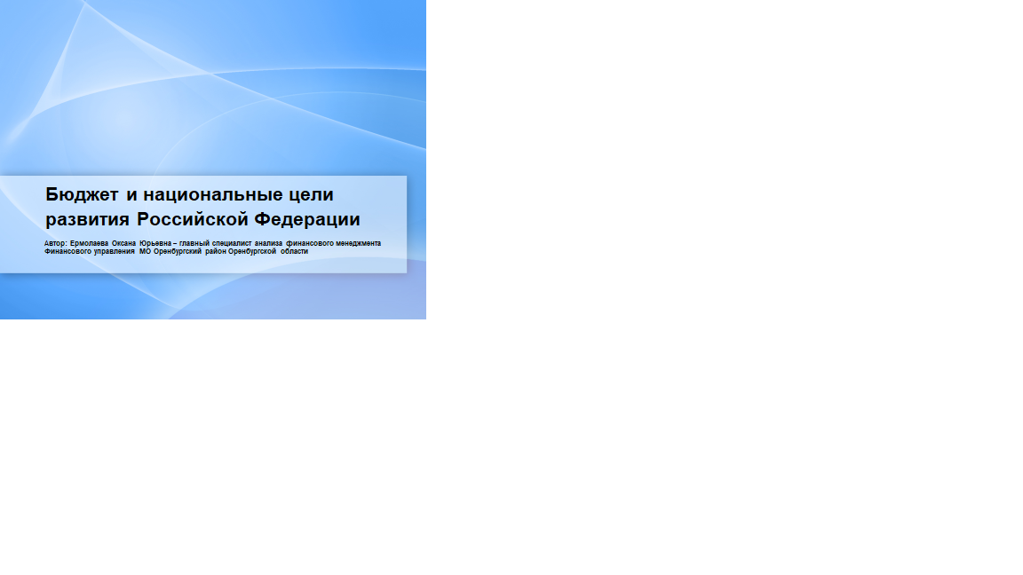 Ермолаева, Оксана Юрьевна. Бюджет и национальные цели развития Российской Федерации. [Электронный ресурс.]: 3е место / Оксана Юрьевна Ермолаева; Финансовый университет ; Финансовое управление МО Оренбургский район Оренбургской области. — Электронные данные (1 файл 14,6Мб). — Только электронный ресурс;. — Свободный доступ из сети Интернет (чтение, печать, копирование). — <URL:http://elib.fa.ru/STW/2021/konkurs_2021_F9.pptx>.Дата создания записи: 01.10.2021 Тематика: РФ; Россия; полный текст; электронные публикации; бюджет; бюджетные расходы; бюджетные средства; бюджетирование; проекты; конкурсы; Представление бюджета для граждан; 2021 г.; местный бюджет; региональный бюджет; бюджетная система; интерактивные методы; муниципальная система; гражданские инициативы Разрешенные действия: –