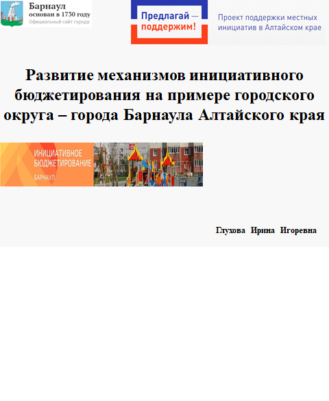 Глухова, Ирина Игоревна. Развитие механизмов инициативного бюджетирования на примере городского округа - города Барнаула Алтайского края . [ Электронный ресурс.]: Лучшее предложение по изменению бюджетного законодательства. / Ирина Игоревна Глухова. — Электронные данные (1 файл 1.90Мб). — Только электронный ресурс;. — Свободный доступ из сети Интернет (чтение, печать, копирование). — <URL:http://elib.fa.ru/STW/2024/gluhova_740.pptx>.