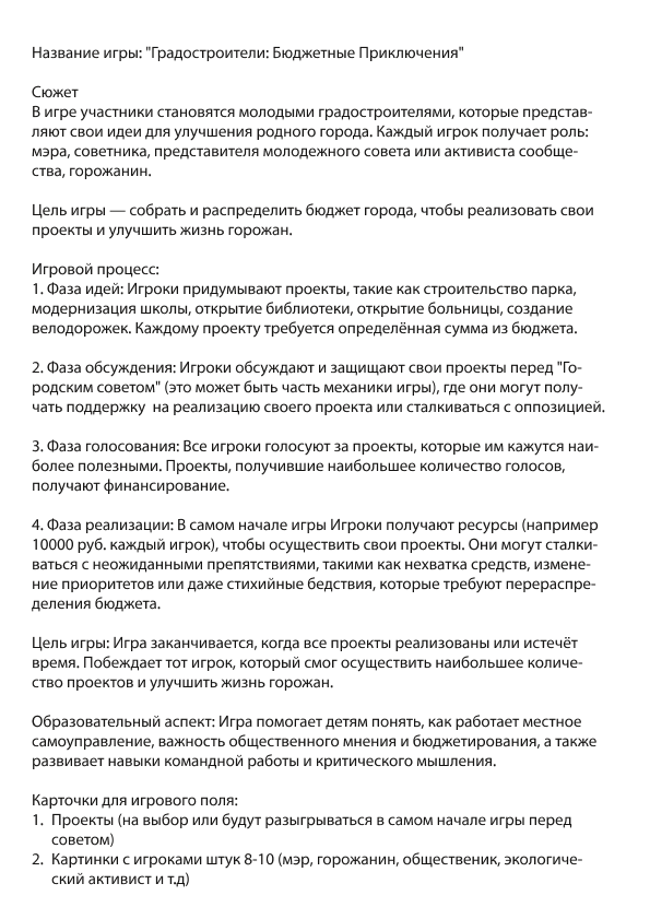 Колесникова, Е.С. Игра: "Градостроители: Бюджетные Приключения": Диплом 2 степени / Е.С. Колесникова, Б.В. Чагаева. — Электронные данные (1 файл 2Мб). — Только электронный ресурс;. — Свободный доступ из сети Интернет (чтение, печать, копирование). — <URL:http://elib.fa.ru/STW/2025/Kolesnikova.pdf>.Record create date: 10/2/2025 Subject: РФ; Россия; полный текст; электронные публикации; бюджет; бюджетные расходы; бюджетные средства; бюджетирование; проекты; конкурсы; Представление бюджета для граждан; местный бюджет; региональный бюджет; бюджетная система; интерактивные методы; муниципальная система; гражданские инициативы Allowed Actions: Read Download (8.3 Mb) Group: Anonymous Network: Internet |