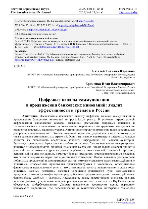 Базалей, Т.Ю. Цифровые каналы коммуникации в продвижении банковских инноваций: анализ эффективности и трендов в России / Т.Ю. Базалей, И.В. Еременко. — Текст: электронный // Вестник Евразийской науки. – 2025. – № s1. — URL: https://esj.today/PDF/13FAVN125.pdf (дата обращения: 17.09.2025) — <URL:http://elib.fa.ru/art2025/bv350.pdf>.Record create date: 10/15/2025 Subject: РФ; цифровая система коммуникаций; инновации; банковская система; мобильная связь; искусственный интеллект; Big data; большие данные; кибербезопасность; банковский маркетинг; финансовые технологии; финтех; "банковские инновации"; "мобильные приложения"; "push-уведомления"; "чат-бот"; обмен информацией; аналитические методы; социальные сети; "мессенджеры"; "e-mail-маркетинг"; "контент-маркетинг"; персонализация; омниканальность; стратегия развития; электронные публикации; полный текст Allowed Actions: –