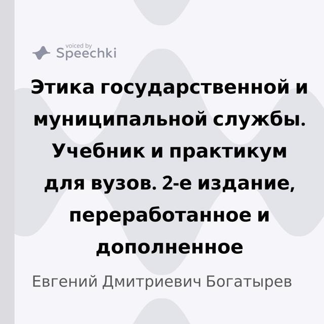 Богатырев, Е.Д. Этика государственной и муниципальной службы: учебник и практикум для вузов / Е.Д. Богатырев, А.Н. Беляев, С.Г. Еремин; под ред. С.Е. Прокофьева; Speechki. Сервис автоматического создания аудиоверсий статей. — 2-е изд., перераб. и доп. — Москва: Юрайт, 2022. — 17 аудиофайлов Mp3 (общая продолжительность звучания 11 ч. 20 мин.): 680 Мб. — Доступ по паролю из сети Интернет (чтение). — <URL:http://elib.fa.ru/book/92444290exmo11337>. — Устная речь: аудиоRecord create date: 9/15/2022 Subject: Аудиофайлы; учебные издания; авторы ФА; электронные публикации; устная речь; учебники; практикумы; государственная служба; этика UDC: 35 Collections: Аудиокниги Allowed Actions: –