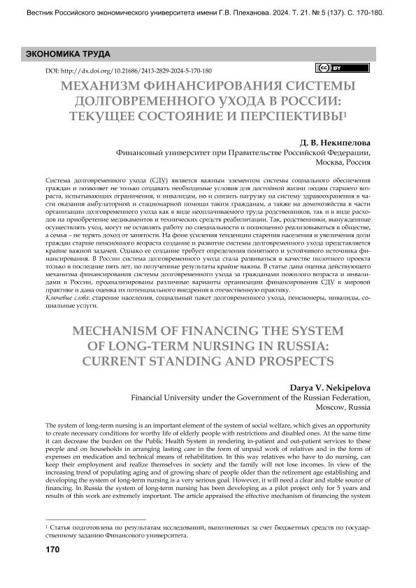 Некипелова, Д.В. Механизм финансирования системы долговременного ухода в России // Вестник Российского экономического университета имени Г.В. Плеханова. – 2024. – № 5. — С. 170-180. — Только в электронном виде. — <URL:http://elib.fa.ru/art2024/bv3350.pdf>.