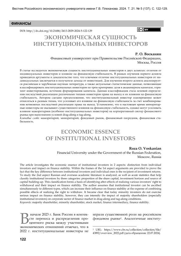 Восканян, Р.О. Экономическая сущность институциональных инвесторов // Вестник Российского экономического университета имени Г.В. Плеханова. – 2024. – № 5. — С. 122-129. — Только в электронном виде. — <URL:http://elib.fa.ru/art2024/bv3351.pdf>.