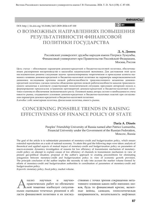 Динец, Д.А. О возможных направлениях повышения результативности финансовой политики государства // Вестник Российского экономического университета имени Г.В. Плеханова. – 2024. – № 6. — С. 87-100. — Только в электронном виде. — <URL:http://elib.fa.ru/art2024/bv3352.pdf>.