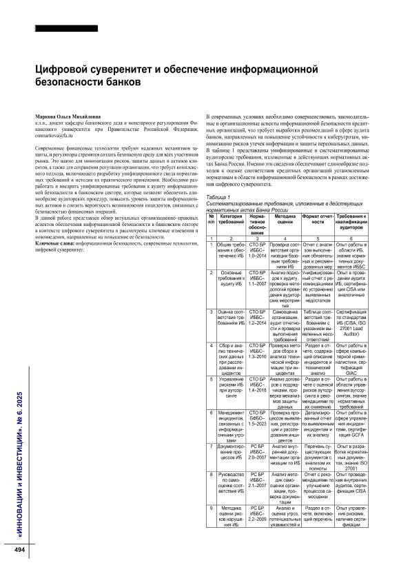 Маркова, О.М. Цифровой суверенитет и обеспечение информационной безопасности банков // Инновации и инвестиции. – 2025. – № 6. — С. 494-497. — Только в электронном виде. — <URL:http://elib.fa.ru/art2025/bv1769.pdf>.