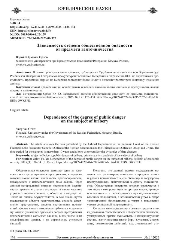 Орлов, Ю.Ю. Зависимость степени общественной опасности от предмета взяточничества // Вестник экономической безопасности. – 2025. – № 1. — С. 126-134. — Только в электронном виде. — <URL:http://elib.fa.ru/art2025/bv1770.pdf>.