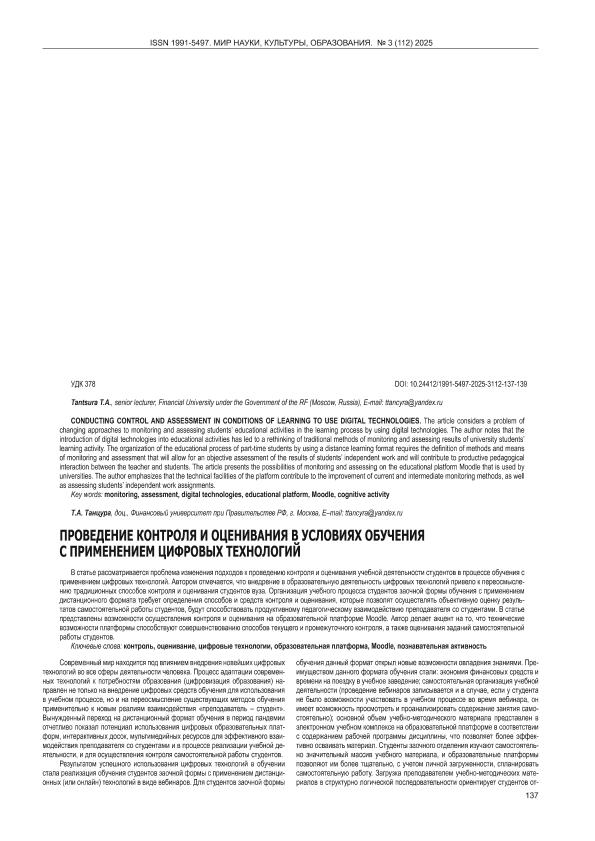 Танцура, Т.А. Проведение контроля и оценивания в условиях обучения с применением цифровых технологий // Мир науки, культуры, образования. – 2025. – № 3. — С. 137-139. — Только в электронном виде. — <URL:http://elib.fa.ru/art2025/bv1771.pdf>.