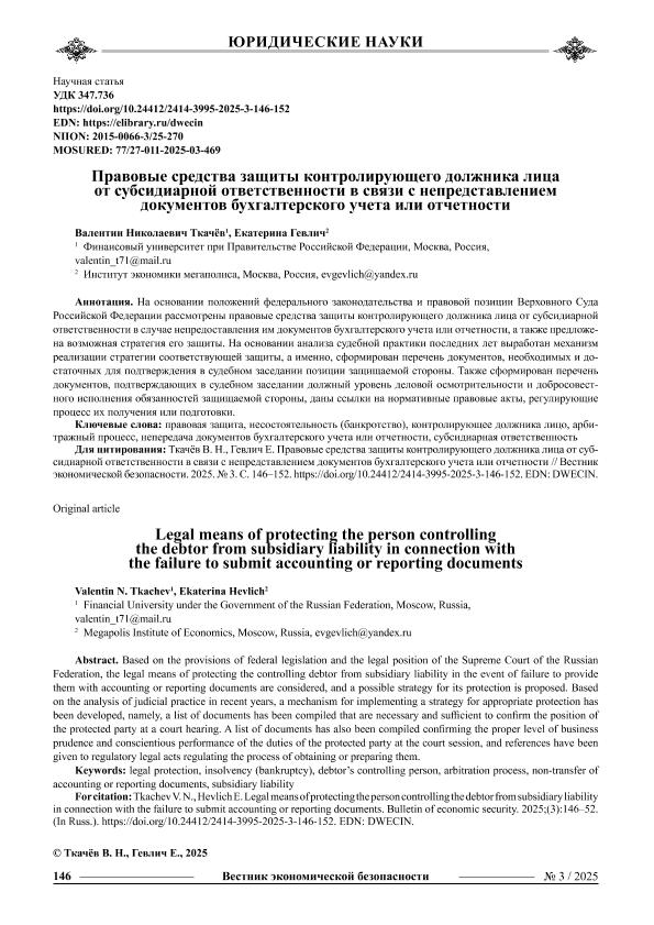 Ткачёв, В.Н. Правовые средства защиты контролирующего должника лица от субсидиарной ответственности в связи с непредставлением документов бухгалтерского учета или отчетности / В.Н. Ткачёв, Е. Гевлич // Вестник экономической безопасности. – 2025. – № 3. — С. 146-152. — Только в электронном виде. — <URL:http://elib.fa.ru/art2025/bv1772.pdf>.