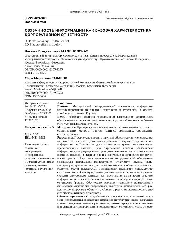 Малиновская, Н.В. Связанность информации как базовая характеристика корпоративной отчетности / Н.В. Малиновская, М.М. Гафаров // Международный бухгалтерский учет. – 2025. – № 6. — С. 4-14. — Только в электронном виде. — <URL:http://elib.fa.ru/art2025/bv2172.pdf>.
