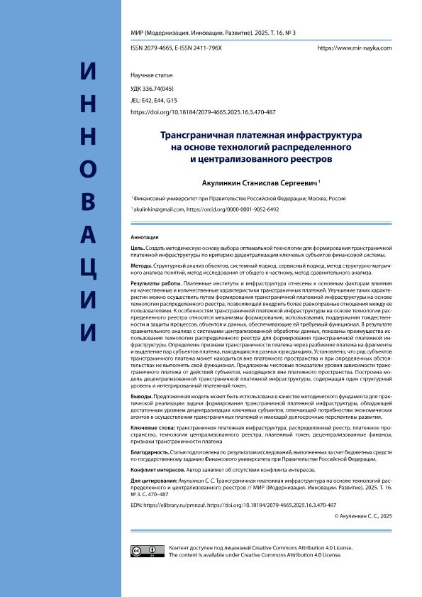 Акулинкин, С.С. Трансграничная платежная инфраструктура на основе технологий распределенного и централизованного реестров // МИР (Модернизация. Инновации. Развитие). – 2025. – № 3. — С. 470-487. — Только в электронном виде. — <URL:http://elib.fa.ru/art2025/bv2174.pdf>.