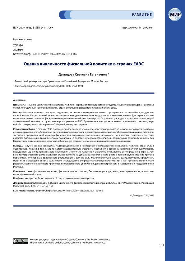 Демидова, С.Е. Оценка цикличности фискальной политики в странах ЕАЭС // МИР (Модернизация. Инновации. Развитие). – 2025. – № 1. — С. 153-166. — Только в электронном виде. — <URL:http://elib.fa.ru/art2025/bv2176.pdf>.