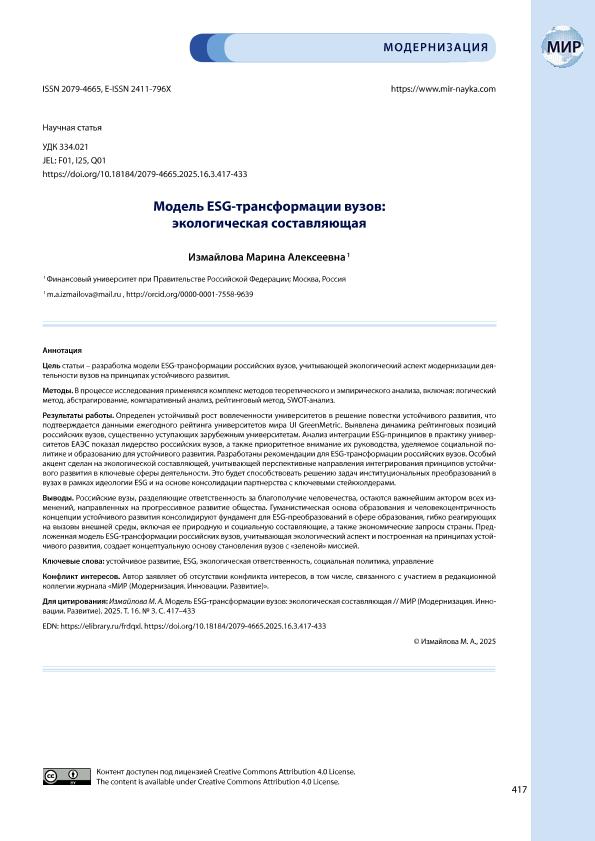 Измайлова, М.А. Модель ESG-трансформации вузов: экологическая составляющая // МИР (Модернизация. Инновации. Развитие). – 2025. – № 3. — С. 417-433. — Только в электронном виде. — <URL:http://elib.fa.ru/art2025/bv2178.pdf>.
