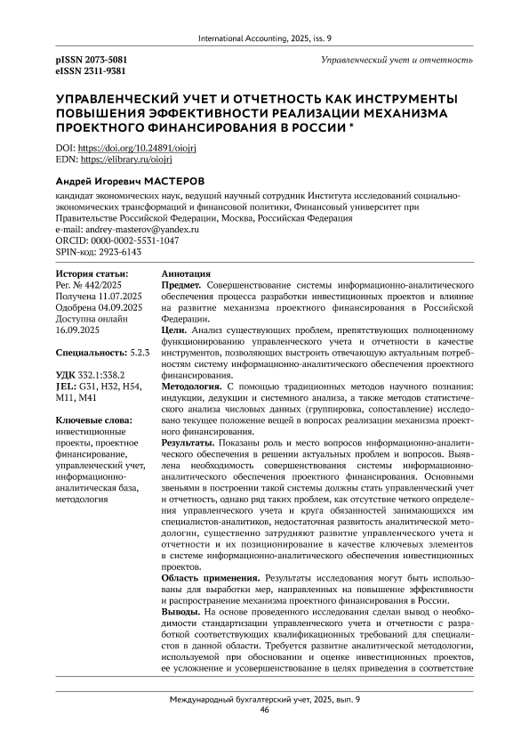 Мастеров, А.И. Управленческий учет и отчетность как инструменты повышения эффективности реализации механизма проектного финансирования в России // Международный бухгалтерский учет. – 2025. – № 9. — С. 46-65. — Только в электронном виде. — <URL:http://elib.fa.ru/art2025/bv2180.pdf>.