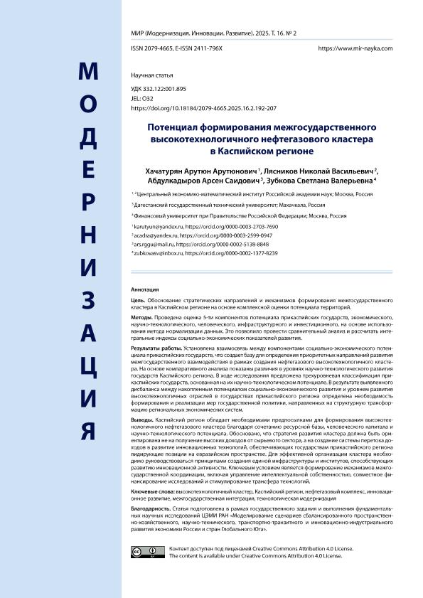 Потенциал формирования межгосударственного высокотехнологичного нефтегазового кластера в Каспийском регионе / А.А. Хачатурян, Н.В. Лясников, А.С. Абдулкадыров, С.В. Зубкова // МИР (Модернизация. Инновации. Развитие). – 2025. – № 2. — С. 192-207. — Только в электронном виде. — <URL:http://elib.fa.ru/art2025/bv2181.pdf>.