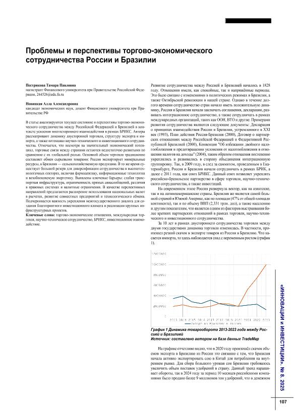 сотрудничества России и Бразилии / Т.П. Пестрикова, А.А. Новицкая // Инновации и инвестиции. – 2025. – № 8. — С. 107-109. — Только в электронном виде. — <URL:http://elib.fa.ru/art2025/bv2082.pdf>.