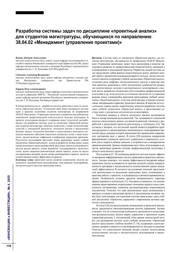 Власов, Д.А. Разработка системы задач по дисциплине «проектный анализ» для студентов магистратуры, обучающихся по направлению 38.04.02 «Менеджмент (управление проектами)» / Д.А. Власов, А.В. Синчуков, П.А.Карасев // Инновации и инвестиции. – 2025. – № 4. — С. 134-138. — Только в электронном виде. — <URL:http://elib.fa.ru/art2025/bv1286.pdf>.