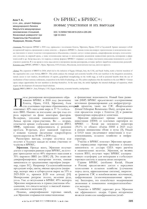 Асон, Т.А. От БРИКС к БРИКС+: новые участники и их выгоды // Риск: ресурсы, информация, снабжение, конкуренция. – 2025. – С. 285-289. — Хранение – Олеко Дундича, 23. — <URL:http://elib.fa.ru/art2025/bv1789.pdf>.