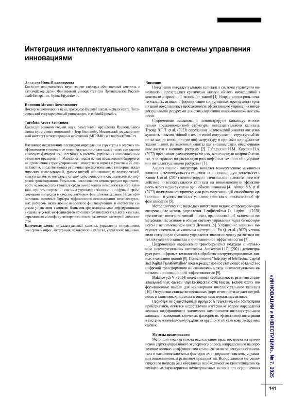 Липатова, И.В. Интеграция интеллектуального капитала в системы управления инновациями / И.В. Липатова, М.В. Ивашкин, А.А. Тагибова // Инновации и инвестиции. – 2025. – № 7. — С. 141-144. — Только в электронном виде. — <URL:http://elib.fa.ru/art2025/bv2019.pdf>.