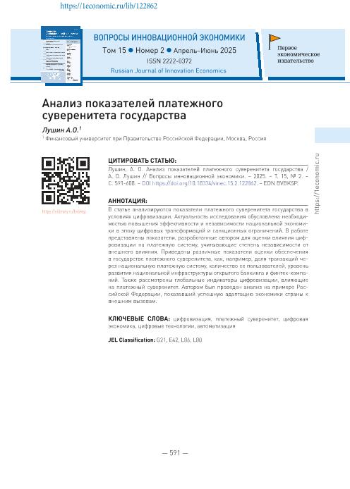 Лушин, А.О. Анализ показателей платежного суверенитета государства. — Текст: электронный // Вопросы инновационной экономики. – 2025. – № 2. — С. 591-608. - URL: https://1economic.ru/lib/122862 (дата обращения: 13.02.2026) — <URL:http://elib.fa.ru/art2025/bv2021.pdf>.