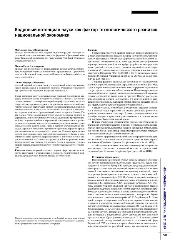 Манусаджян, О.В. Кадровый потенциал науки как фактор технологического развития национальной экономики / О.В. Манусаджян, Е.В. Михина, М.И. Лисина // Инновации и инвестиции. – 2025. – № 7. — С. 387-391. — Только в электронном виде. — <URL:http://elib.fa.ru/art2025/bv2022.pdf>.