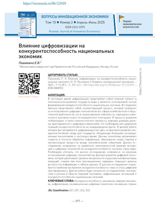Пашихина, Е.В. Влияние цифровизации на конкурентоспособность национальных экономик. — Текст: электронный // Вопросы инновационной экономики. – 2025. – № 2. — С. 399-412. - URL: https://1economic.ru/lib/122929 (дата обращения: 13.02.2026) — <URL:http://elib.fa.ru/art2025/bv2042.pdf>.