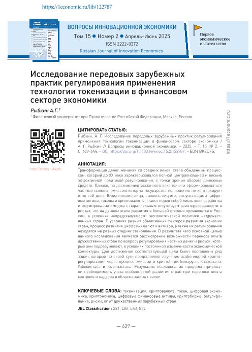 Рыбкин, А.Г. Исследование передовых зарубежных практик регулирования применения технологии токенизации в финансовом секторе экономики. — Текст: электронный // Вопросы инновационной экономики. – 2025. – № 2. — С. 629-644. - URL: https://1economic.ru/lib/122787 (дата обращения: 13.02.2026) — <URL:http://elib.fa.ru/art2025/bv2047.pdf>.