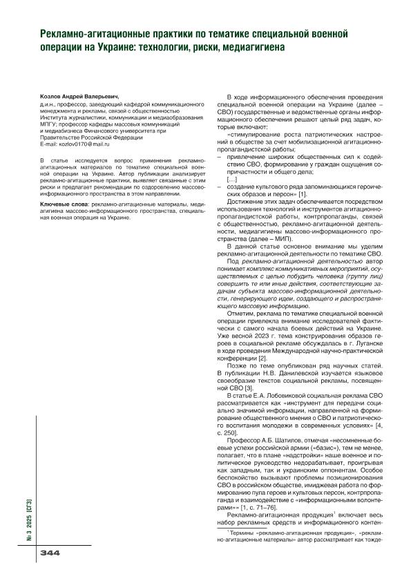 Козлов, А.В. Рекламно-агитационные практики по тематике специальной военной операции на Украине: технологии, риски, медиагигиена // Социально-гуманитарные знания. – 2025. – № 3. — С. 344-348. — Только в электронном виде. — <URL:http://elib.fa.ru/art2025/bv2551.pdf>.