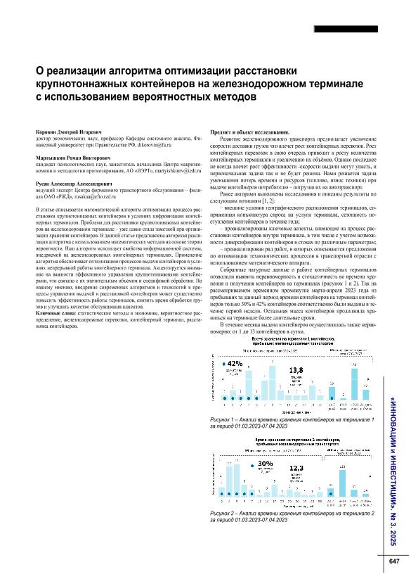 крупнотоннажных контейнеров на железнодорожном терминале с использованием вероятностных методов / Д.И. Коровин, Р.В. Мартышкин, А.А. Русак // Инновации и инвестиции. – 2025. – № 3. — С. 647-651. — Только в электронном виде. — <URL:http://elib.fa.ru/art2025/bv1515.pdf>.