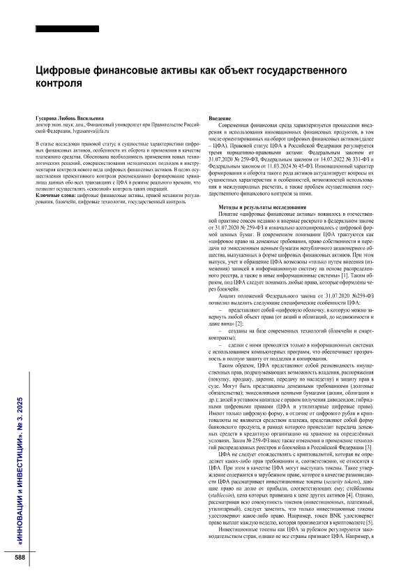 Гусарова, Л.В. Цифровые финансовые активы как объект государственного контроля // Инновации и инвестиции. – 2025. – № 3. — С. 588-590. — Только в электронном виде. — <URL:http://elib.fa.ru/art2025/bv1510.pdf>.