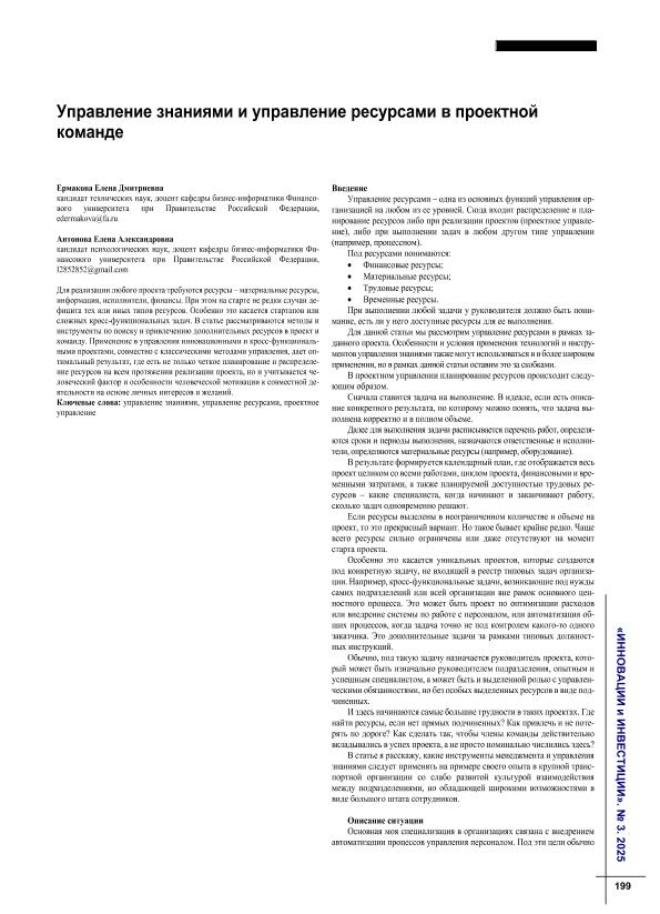 Ермакова, Е.Д. Управление знаниями и управление ресурсами в проектной команде / Е.Д. Ермакова, Е.А. Антонова // Инновации и инвестиции. – 2025. – № 3. — С. 199-201. — Только в электронном виде. — <URL:http://elib.fa.ru/art2025/bv1511.pdf>.