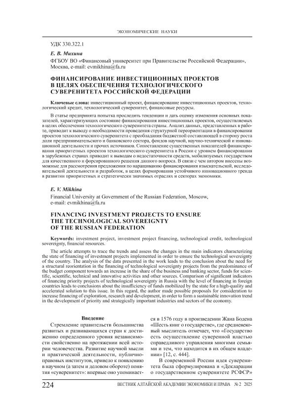 Михина, Е.В. Финансирование инвестиционных проектов в целях обеспечения технологического суверенитета Российской Федерации // Вестник Алтайской академии экономики и права. – 2025. – № 2-2. — С. 224-232. — Только в электронном виде. — <URL:http://elib.fa.ru/art2025/bv951.pdf>.