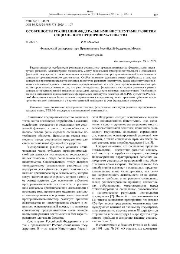 Мамедов, Р.В. Особенности реализации федеральными институтами развития социального предпринимательства // Вестник Нижегородского университета им. Н.И. Лобачевского. – 2025. – № 1. — С. 107-113. — Только в электронном виде. — <URL:http://elib.fa.ru/art2025/bv952.pdf>.