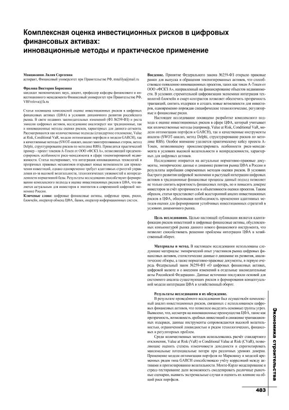 Мнацаканян, Л.С. Комплексная оценка инвестиционных рисков в цифровых финансовых активах: инновационные методы и практическое применение / Л.С. Мнацаканян, В.Б. Фролова // Экономика строительства. – 2025. – № 4. — С. 483-485. — Только в электронном виде. — <URL:http://elib.fa.ru/art2025/bv954.pdf>.
