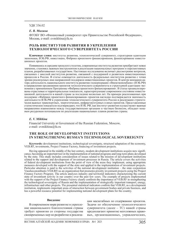 Михина, Е.В. Роль институтов развития в укреплении технологического суверенитета России // Вестник Алтайской академии экономики и права. – 2025. – № 4-2. — С. 305-316. — Только в электронном виде. — <URL:http://elib.fa.ru/art2025/bv955.pdf>.