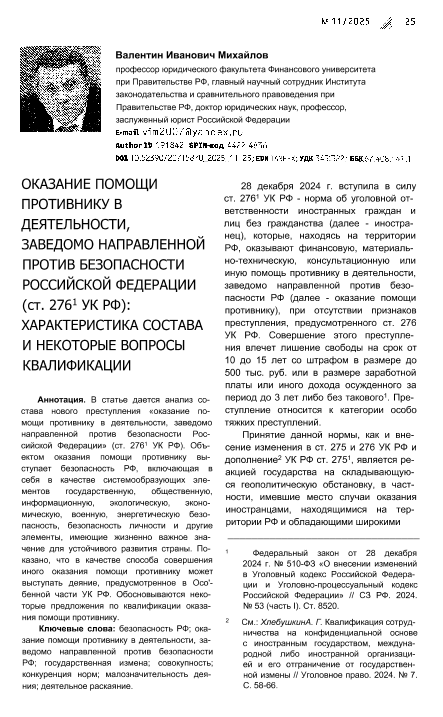 Михайлов, В.И. Оказание помощи противнику в деятельности, заведомо направленной против безопасности Российской Федерации (ст. 2761 УК РФ): характеристика состава и некоторые вопросы квалификации // Уголовное право. – 2025. – № 11. — С. 25-37. — Хранение – Щербаковская, 38. — <URL:http://elib.fa.ru/art2025/bv956.pdf>.