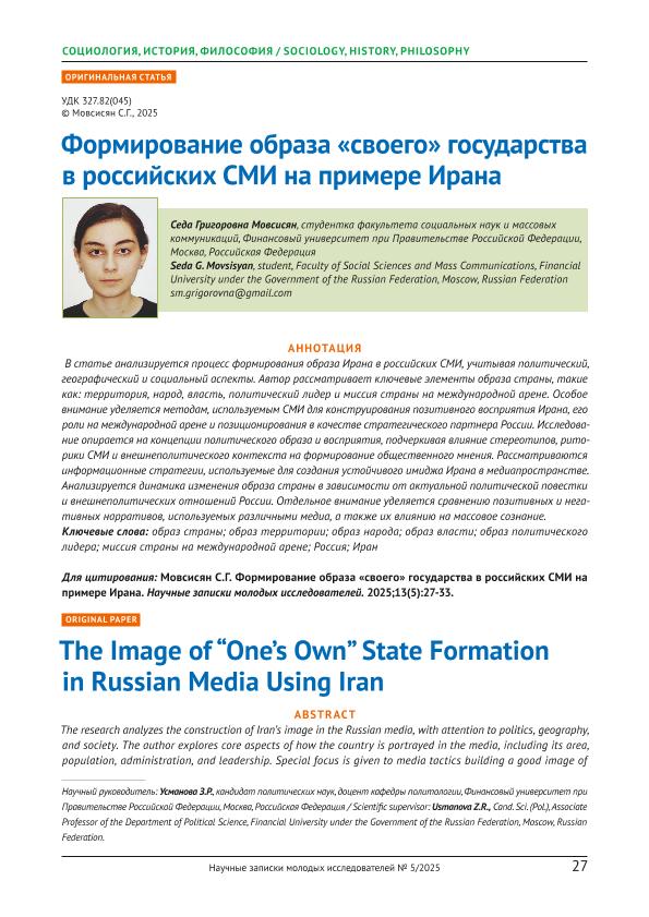Мовсисян, С.Г. Формирование образа «своего» государства в российских СМИ на примере Ирана // Научные записки молодых исследователей. – 2025. – № 5. — С. 27-33 — <URL:http://elib.fa.ru/art2025/bv957.pdf>.