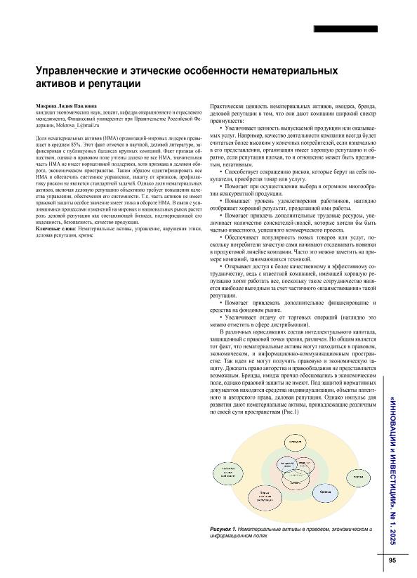Мокрова, Л.П. Управленческие и этические особенности нематериальных активов и репутации // Инновации и инвестиции. – 2025. – № 1. — С. 95-98. — Только в электронном виде. — <URL:http://elib.fa.ru/art2025/bv958.pdf>.