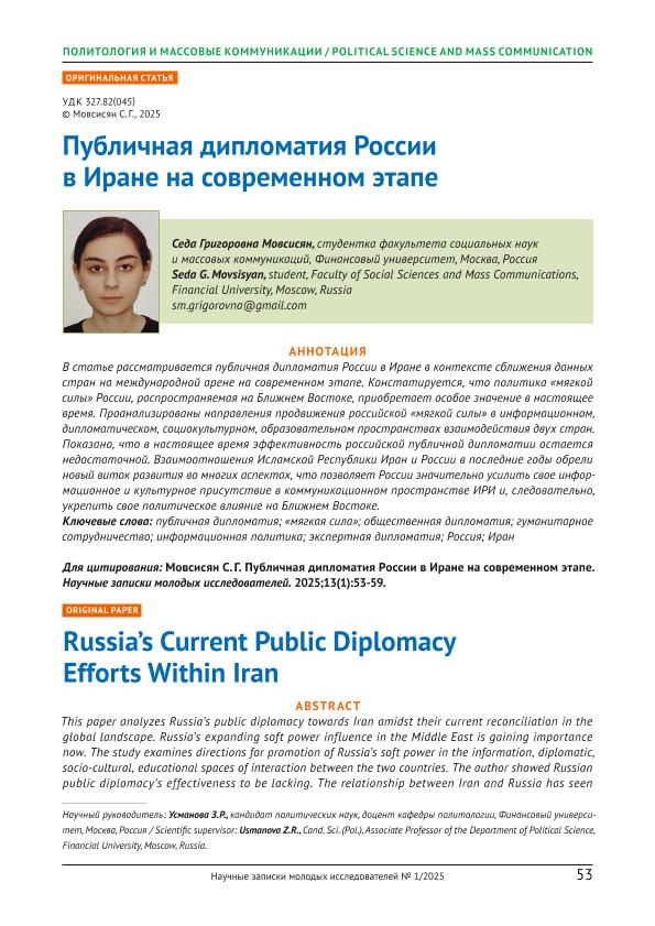 Мовсисян, С.Г. Публичная дипломатия России в Иране на современном этапе // Научные записки молодых исследователей. – 2025. – № 1. — С. 53-59 — <URL:http://elib.fa.ru/art2025/bv959.pdf>.