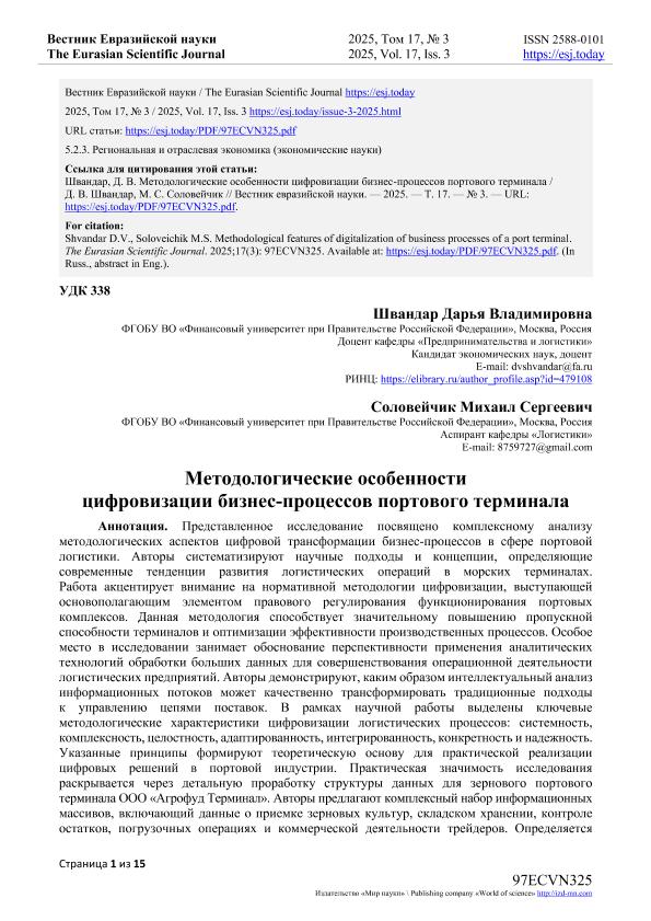 Швандар, Д.В. Методологические особенности цифровизации бизнес-процессов портового терминала / Д.В. Швандар, М.С. Соловейчик. — Текст: электронный // Вестник Евразийской науки. – 2025. – № 3. — URL: https://esj.today/PDF/97ECVN325.pdf (дата обращения: 02.12.2025) — <URL:http://elib.fa.ru/art2025/bv1621.pdf>.
