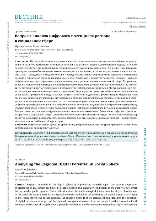 Мухачева, А.В. Вопросы анализа цифрового потенциала региона в социальной сфере // Вестник Кемеровского государственного университета. Серия: Политические, социологические и экономические науки. – 2025. – № 2. — С. 315-326. — Только в электронном виде. — <URL:http://elib.fa.ru/art2025/bv1037.pdf>.