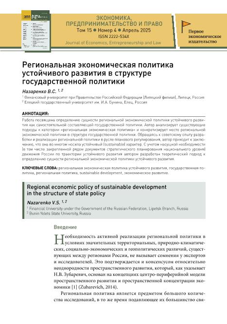 Назаренко, В.С. Региональная экономическая политика устойчивого развития в структуре государственной политики // Экономика, предпринимательство и право. – 2025. – № 4. — С. 2657–2672. — Только в электронном виде. — <URL:http://elib.fa.ru/art2025/bv1038.pdf>.