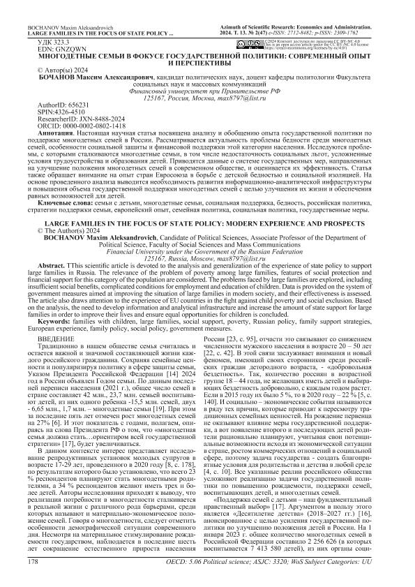 Бочанов, М.А. Многодетные семьи в фокусе государственной политики: современный опыт и перспективы // Азимут научных исследований: экономика и управление. – 2024. – № 2. — С. 178-181. — Только в электронном виде. — <URL:http://elib.fa.ru/art2024/bv3270.pdf>.