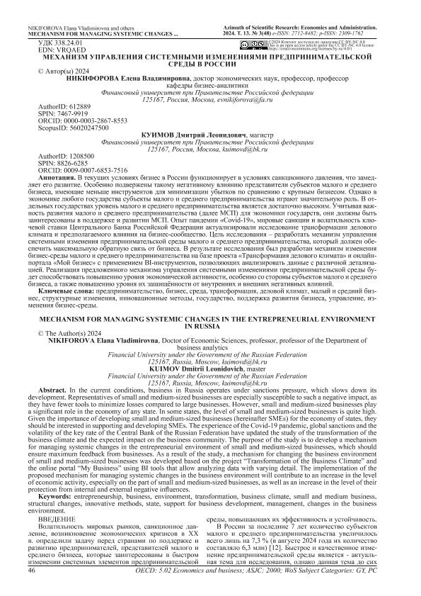 Никифорова, Е.В. Механизм управления системными изменениями предпринимательской среды в России / Е.В. Никифорова, Д.Л. Куимов // Азимут научных исследований: экономика и управление. – 2024. – № 3. — С. 46-49. — Только в электронном виде. — <URL:http://elib.fa.ru/art2024/bv3272.pdf>.
