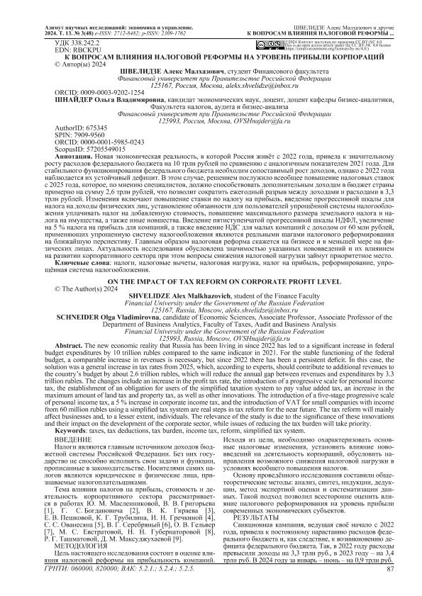 Швелидзе, А.М. К вопросам влияния налоговой реформы на уровень прибыли корпораций / А.М. Швелидзе, О.В. Шнайдер // Азимут научных исследований: экономика и управление. – 2024. – № 3. — С. 87-90. — Только в электронном виде. — <URL:http://elib.fa.ru/art2024/bv3273.pdf>.